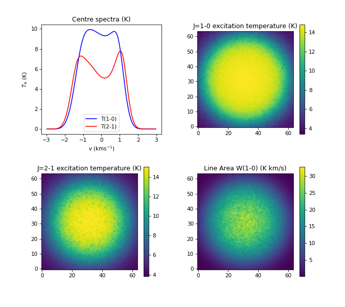The script produces the following figure. The grainy appearance of the Tex and W maps is not caused by numerical noise but by the random velocity field. This can be easily confirmed by recalculating the model without the random velocities (e.g. setting “velocity 0.0” in the ini file or recreating the cloud with some systematic velocity field). The above python programmes (cloud creation and plotting) can be found in LOC_Cartesian_test.zip in the LOC directory of our GitHub page .